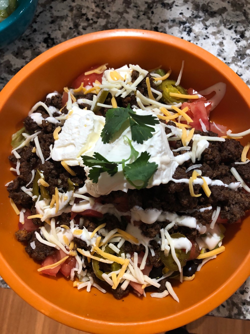 These taco salads are a fun inexpensive dinner. We love to have these for a quick dinner that doesn’t take too much work. We start by crushing Doritos or tortilla chips in a bowl.