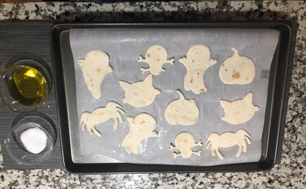 2. Use the cookie cutters to cut out shapes from the tortillas and place each one on the baking sheet