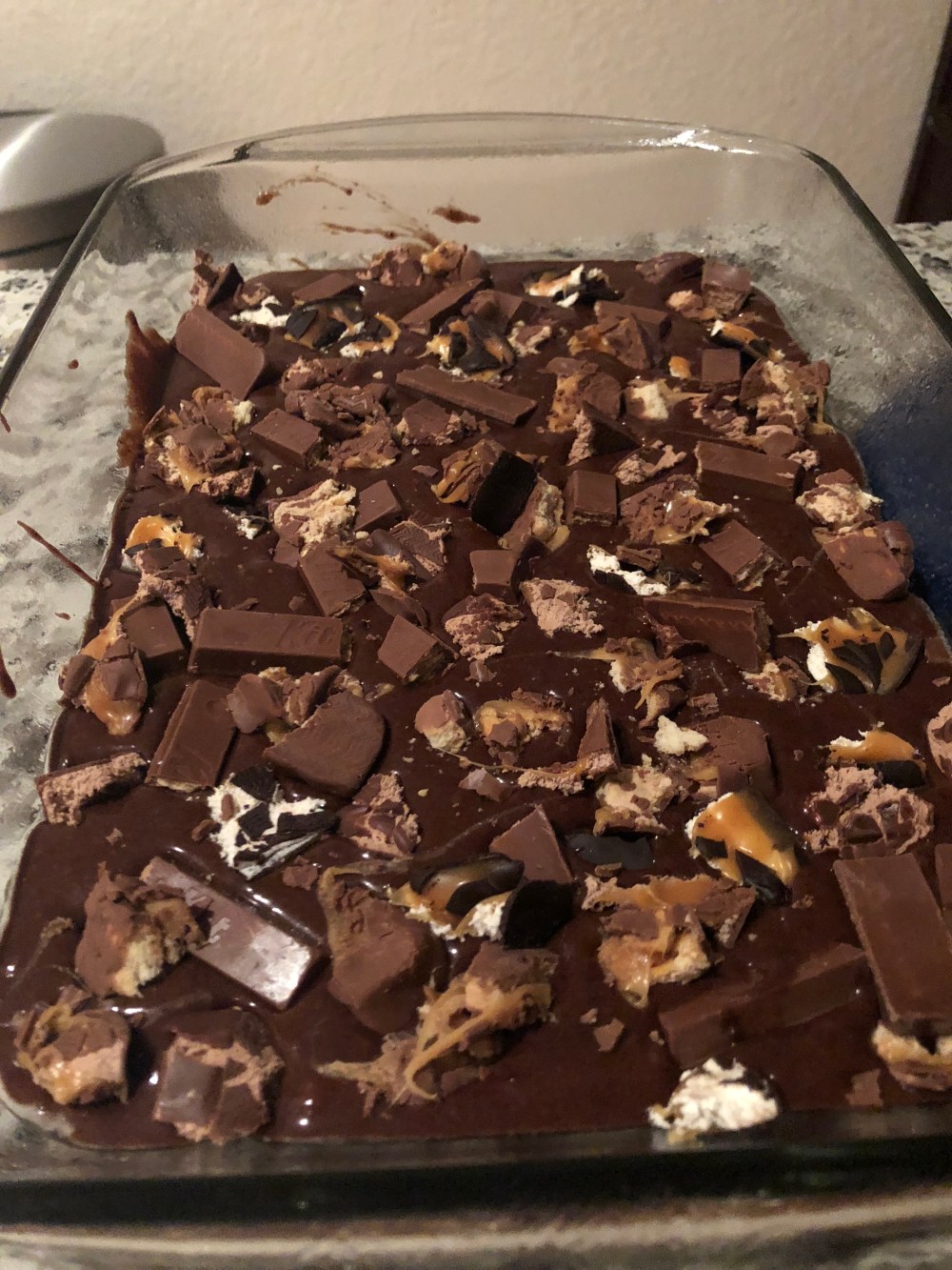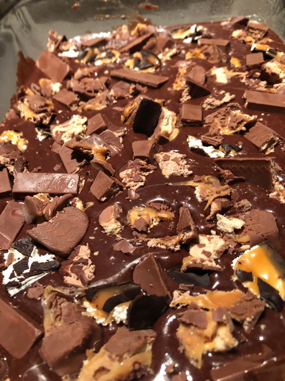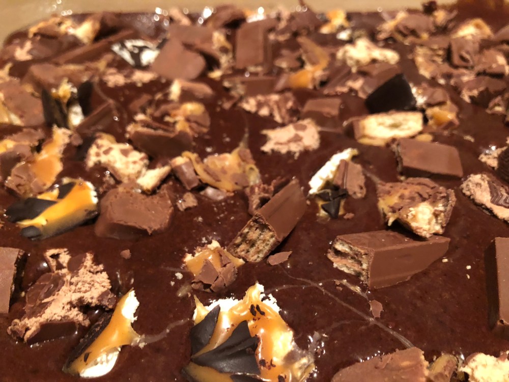 5. When you are finished, pour batter into prepared dish. Now grab some leftover candy and cut or break into pieces. In this batch I used: