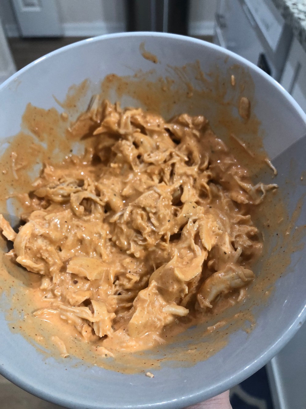 Next, mix shredded chicken with salt and pepper to taste. Then mix 1/3 cup hot sauce and 1/3 cup ranch dressing into the chicken.