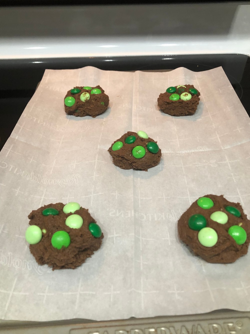 - Scoop cookie dough onto baking sheet. Top with a few mint M&Ms.