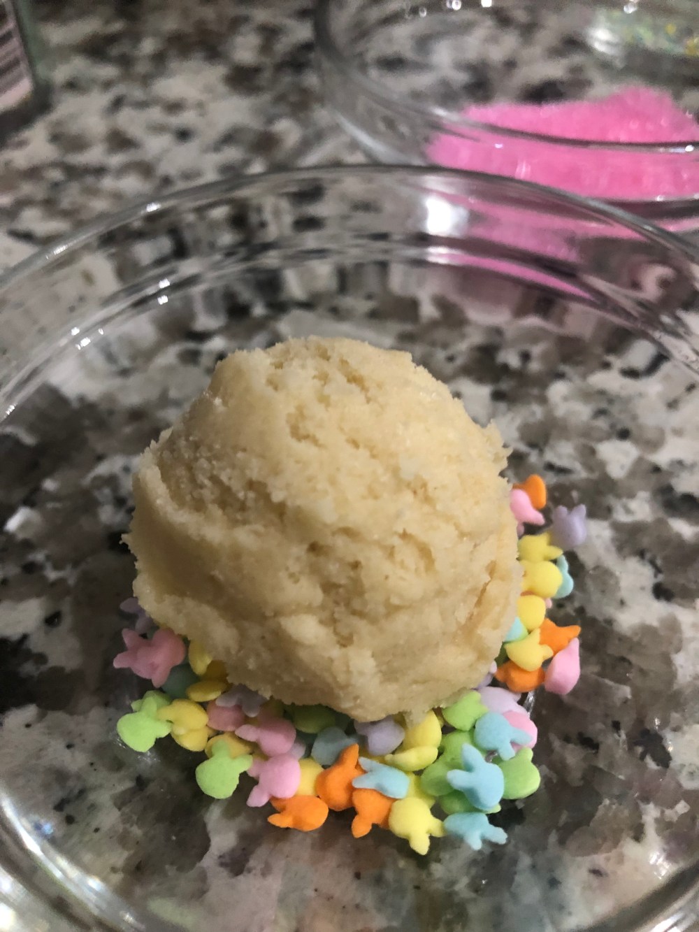 5. Roll balls of cookie dough by hand and prepare dishes of sprinkles