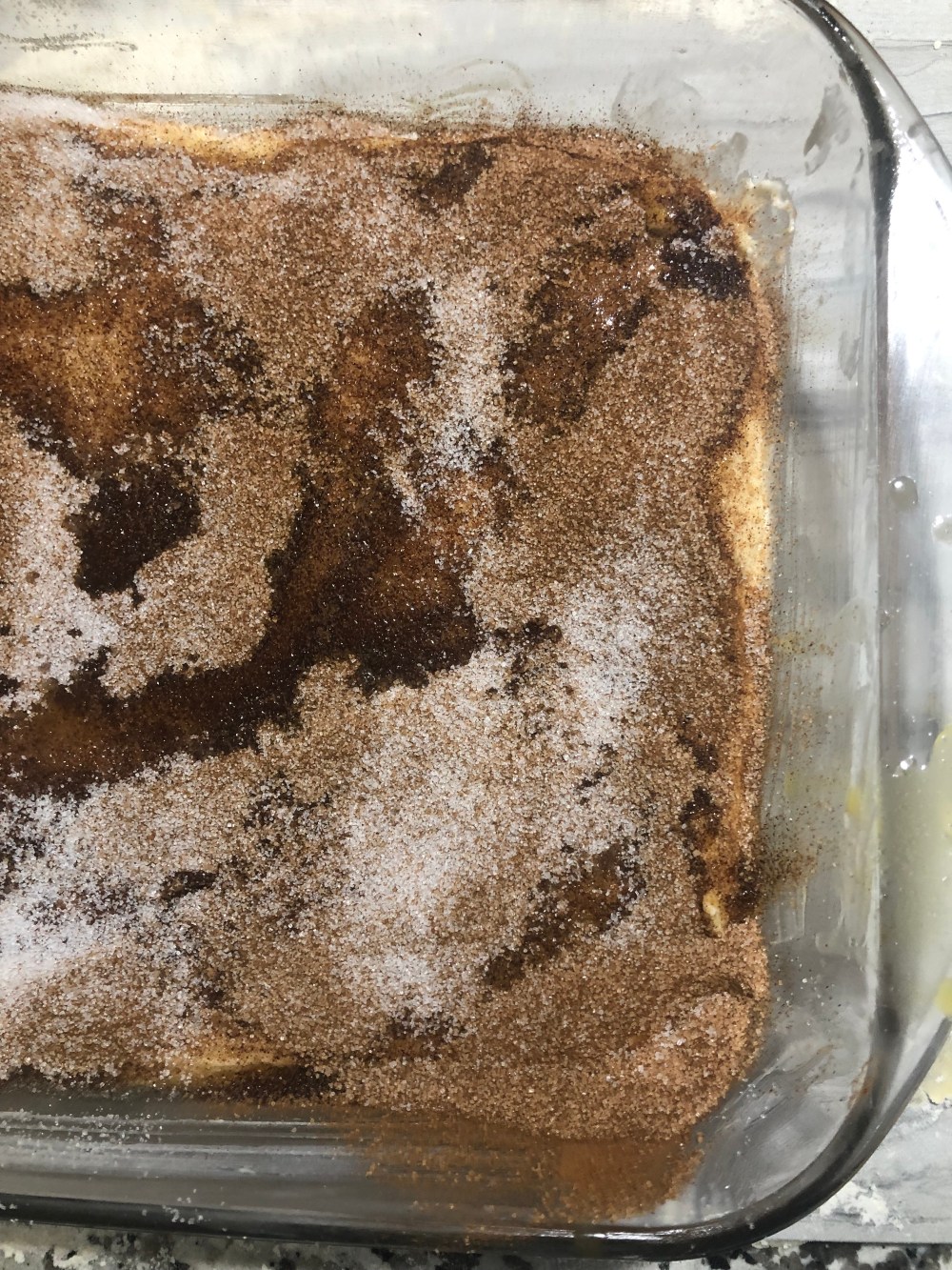 6. Melt butter and drizzle over top of dish. Mix 1/2 cup sugar and cinnamon together and sprinkle on top.