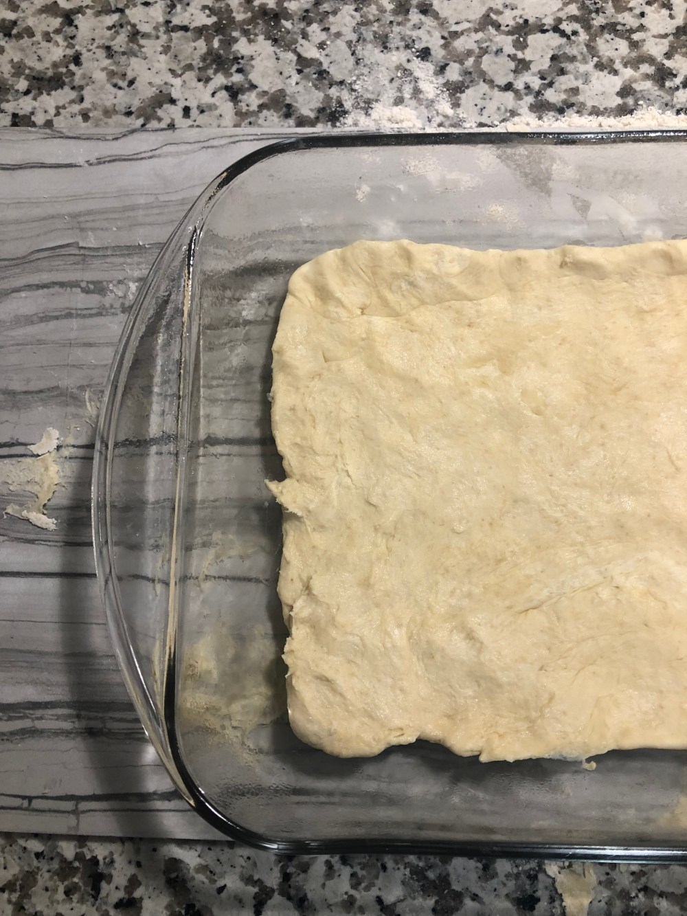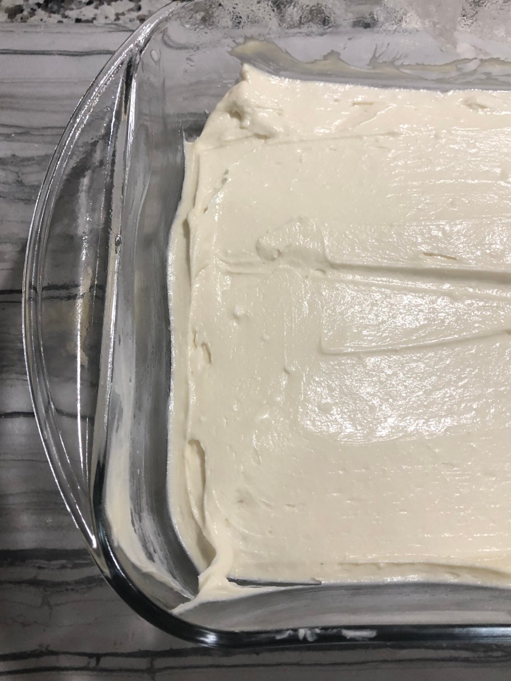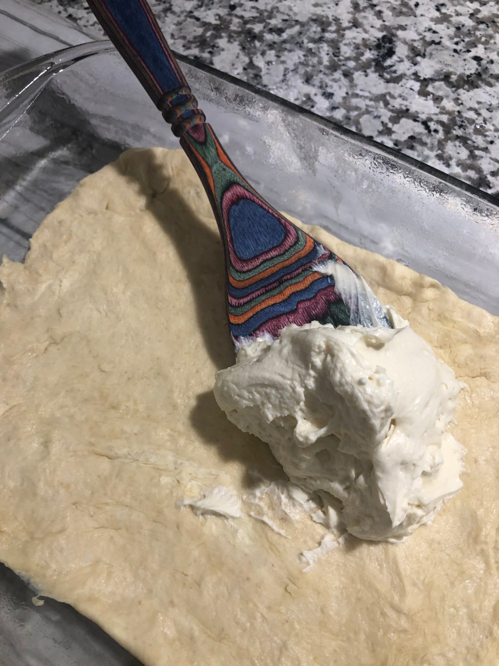 4. Spread cream cheese mixture over the crescent rolls in the dish.