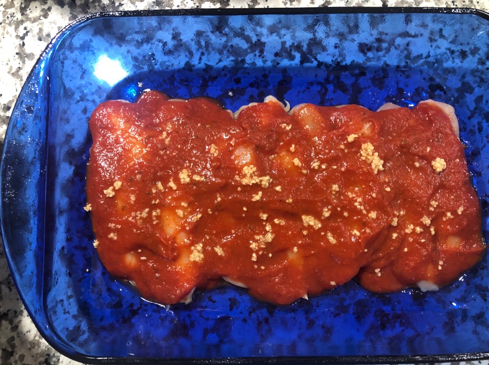 3. Top chicken with sauce and garlic.