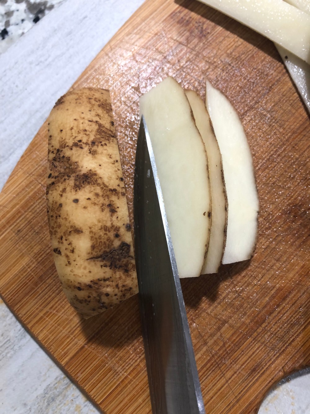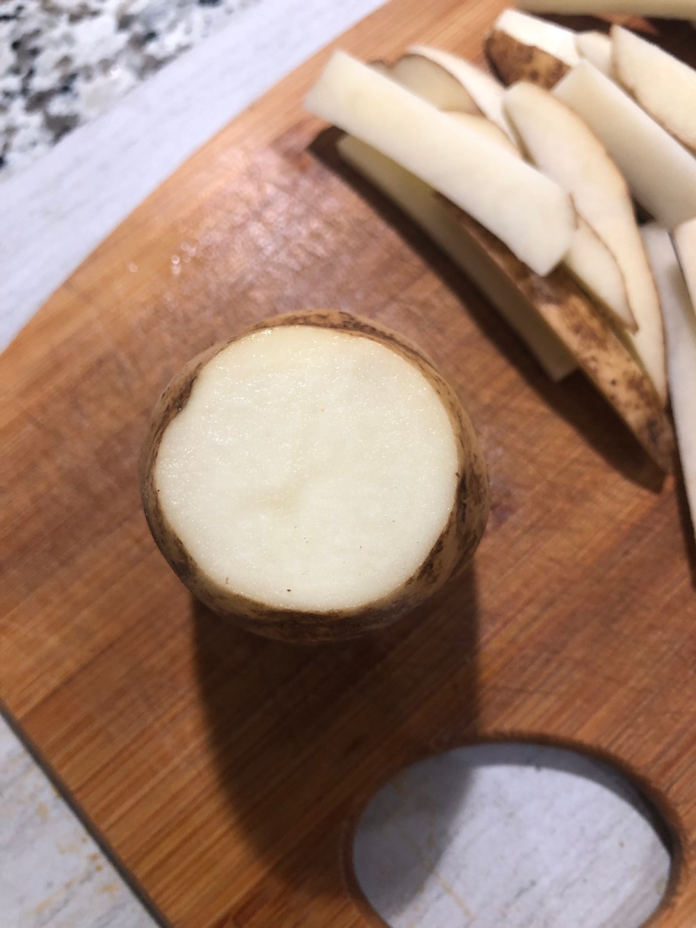 Then take each potato and slice in half longways. Cut each half into strips like fries.